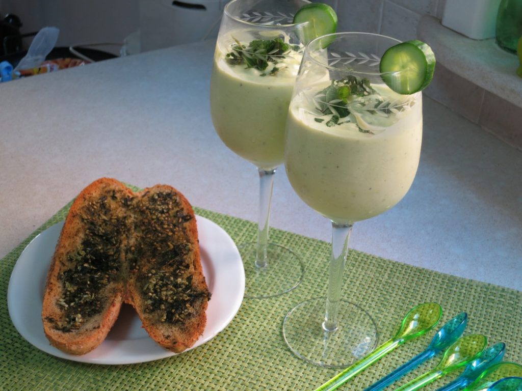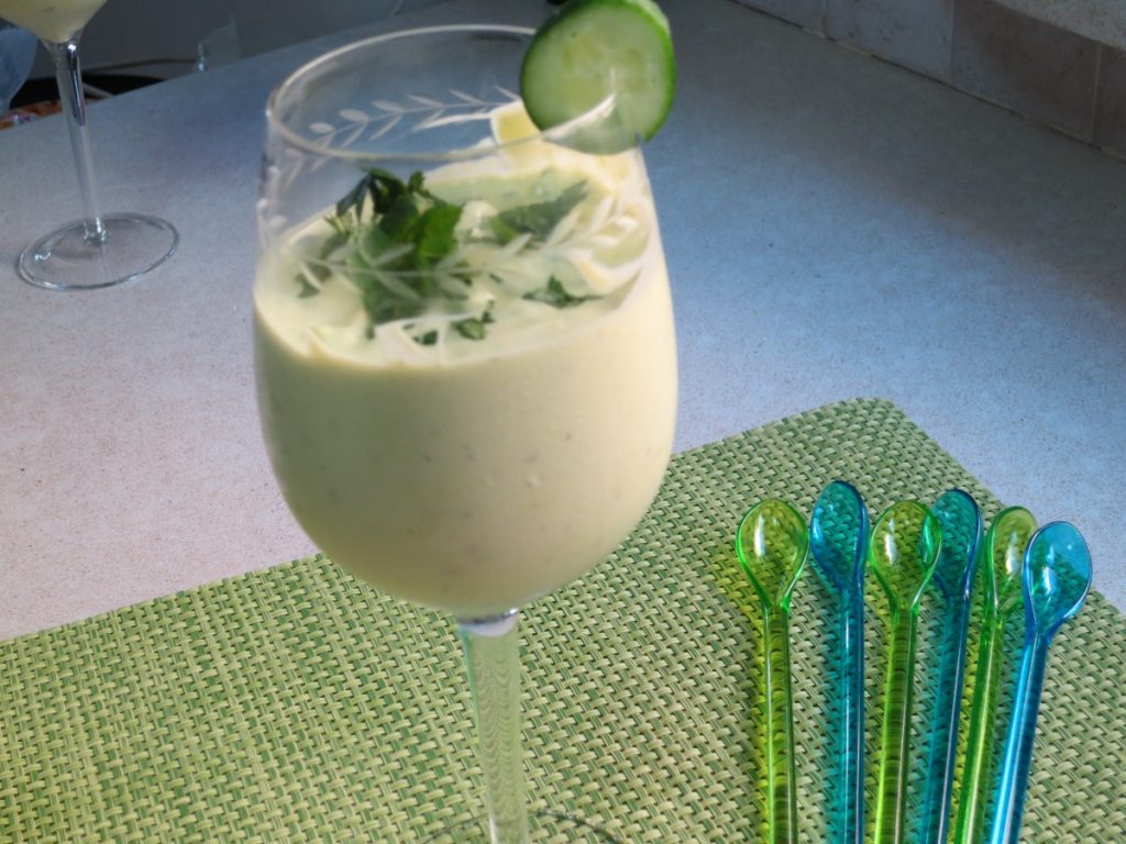 חומרים ליטר יוגורט 1 אבוקדו גדול ובשל – לקלוף ולחתוך קוביות גדולות צרור קטן של נענע – ללא הגבעולים 1 שן שום גדולה מיץ לימון – מחצי לימון קורט מלח חומרים לקישוט פלחי מלפפון – עם הקליפה