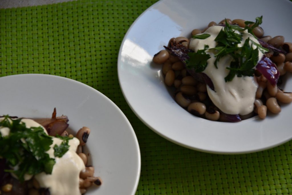 סלט לוביה בצל סגול שום כמון וטחינה – צמחי